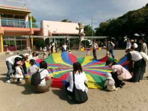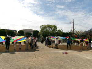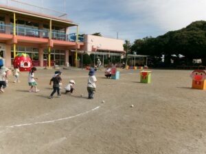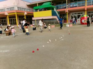 園庭でアンパンマン体操や玉入れ、パラバルーンを使って元気いっぱい身体を動かしました(^^)