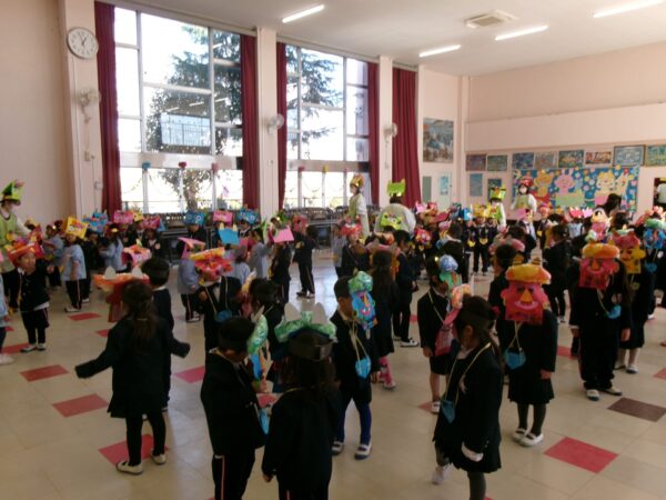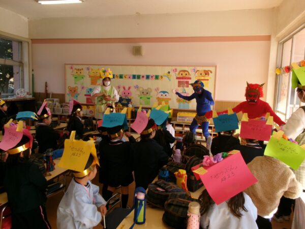 ホールで園長先生のお話を聞いた後、保育室に戻ったら赤おにと青おにがやってきました!